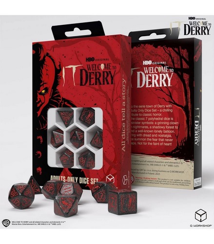 Set de dados de It: Bienvenidos a Derry . Licencia oficial basada en la serie 2025. Incluye 7 dados poligonales cl?sicos: D4, D6, D8, D10, D00, D12 y D20. Dise?o tem?tico de terror: dados con sangre negra y morada, y sangre roja capturada. Iconograf?a de Escalofriante: globo, payaso y madera sombr?a. Recomendado para mayores de 18 a?os,