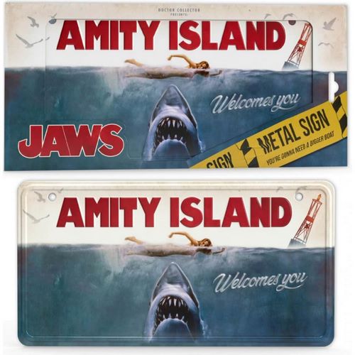 ¡Vamos de vacaciones a Amity Island! Es un lugar paradisiaco y es posible que podamos disfrutar de la regata que estan preparando. Parece que hay rumores de un ataque de tiburon pero seguro que no es nada… ¿Te atreves a ir o prefieres quedarte con un recuerdo? Chapa metálica similar a una matricula con el cartel de “tiburon” impreso. Tamaño33.5cm @16cm